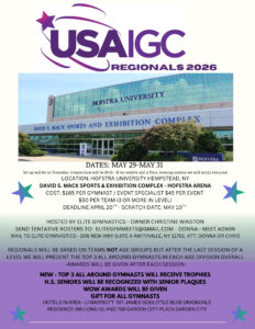 USAIGC REGIONALS 2026 - May 29-31 David S. Mack Sports & Exhibition Complex - Hofstra University Arena $165 per gymnast $45 per event specialist $50 team (3 or more)